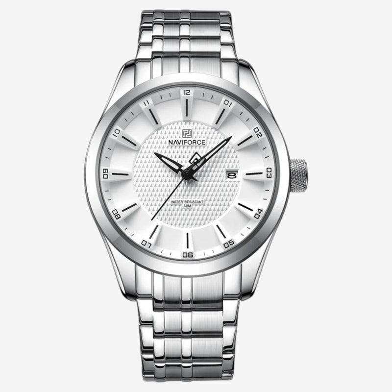 The silver dial with a textured center and metallic markers adds a modern, elegant appearance suitable for both office and leisure settings.