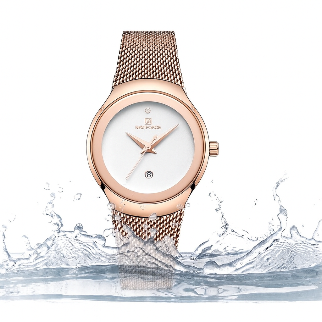 A sleek 32mm rose-gold dial with a stainless-steel mesh band for timeless sophistication.