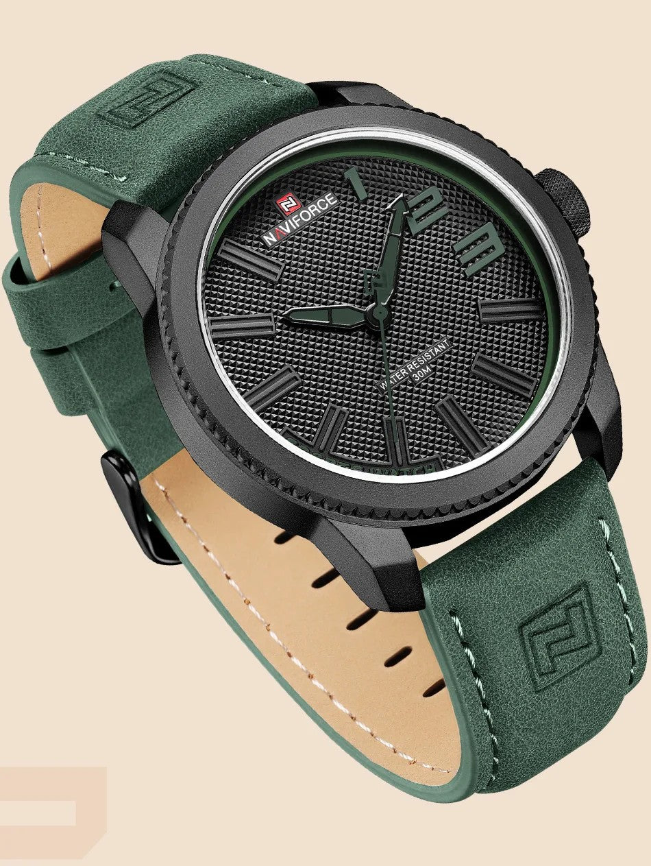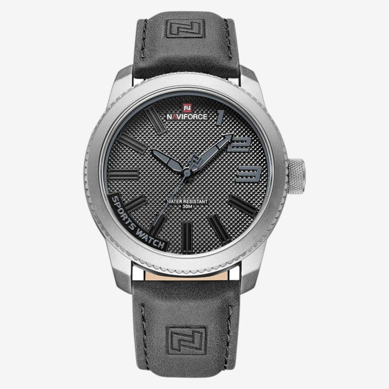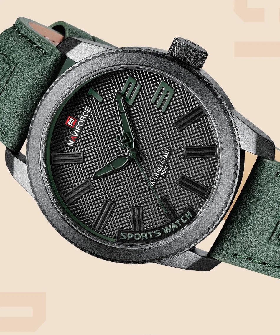 Embossed NAVIFORCE detailing, bold indexes, and textured dial for a strong, masculine look.