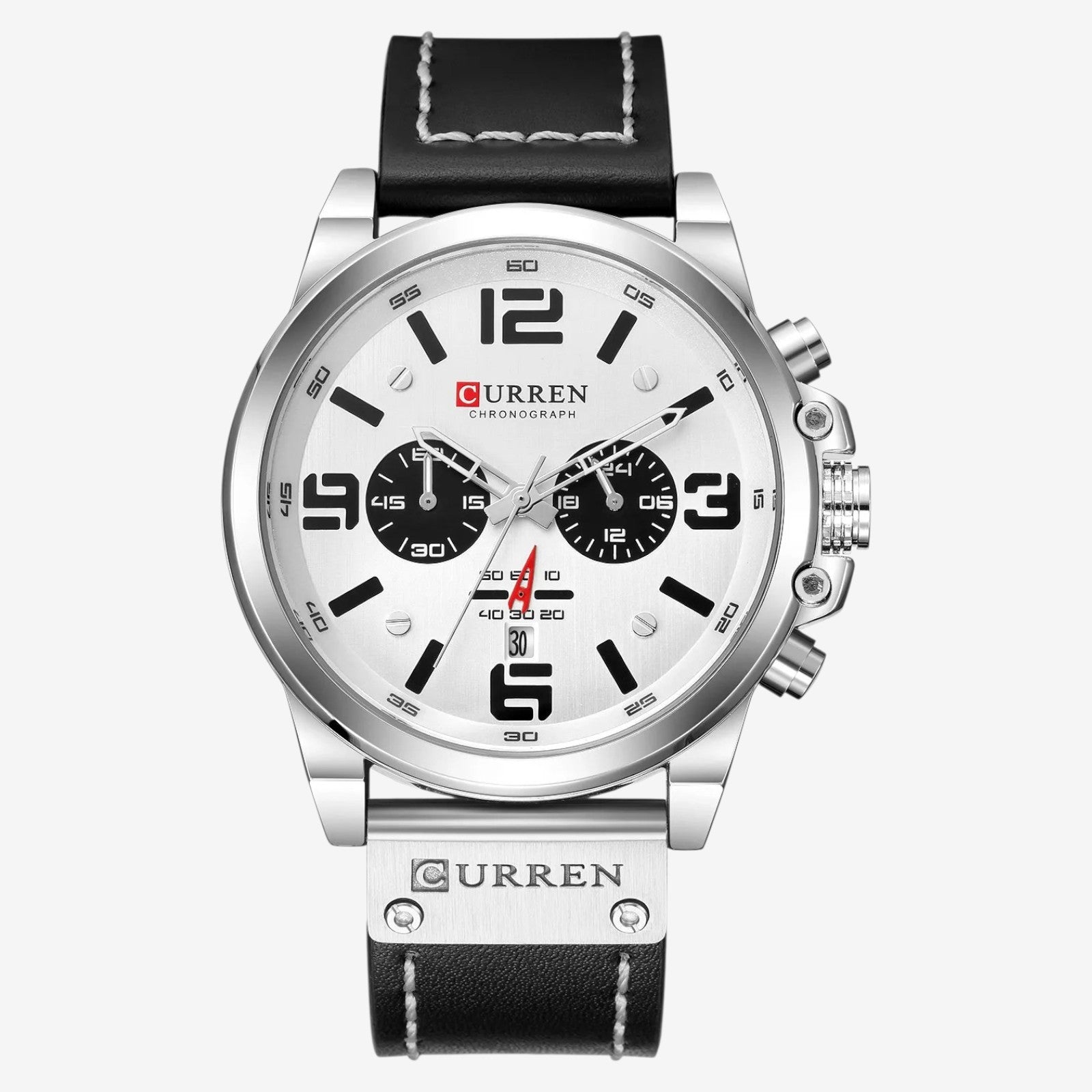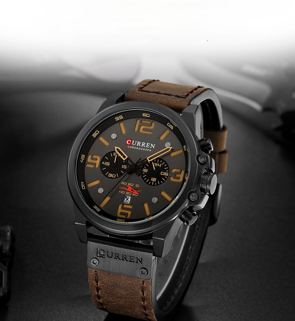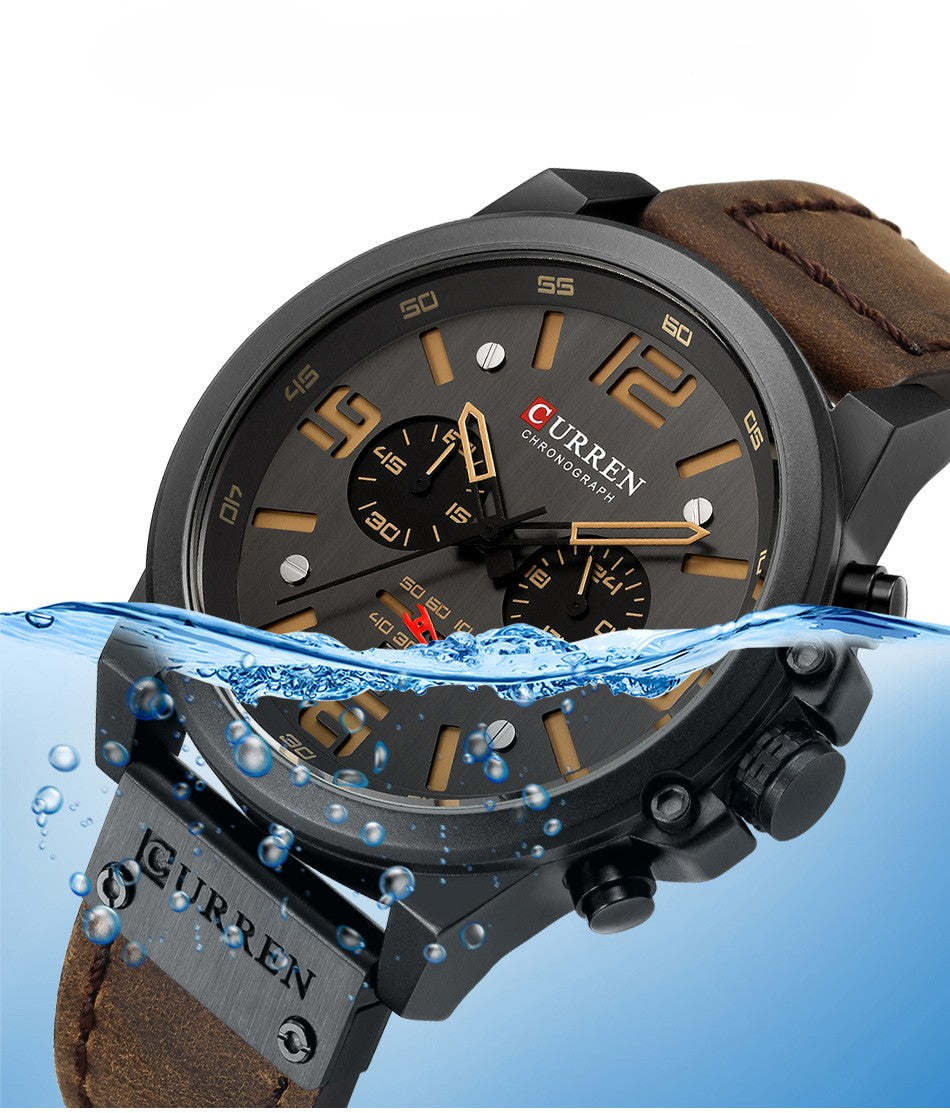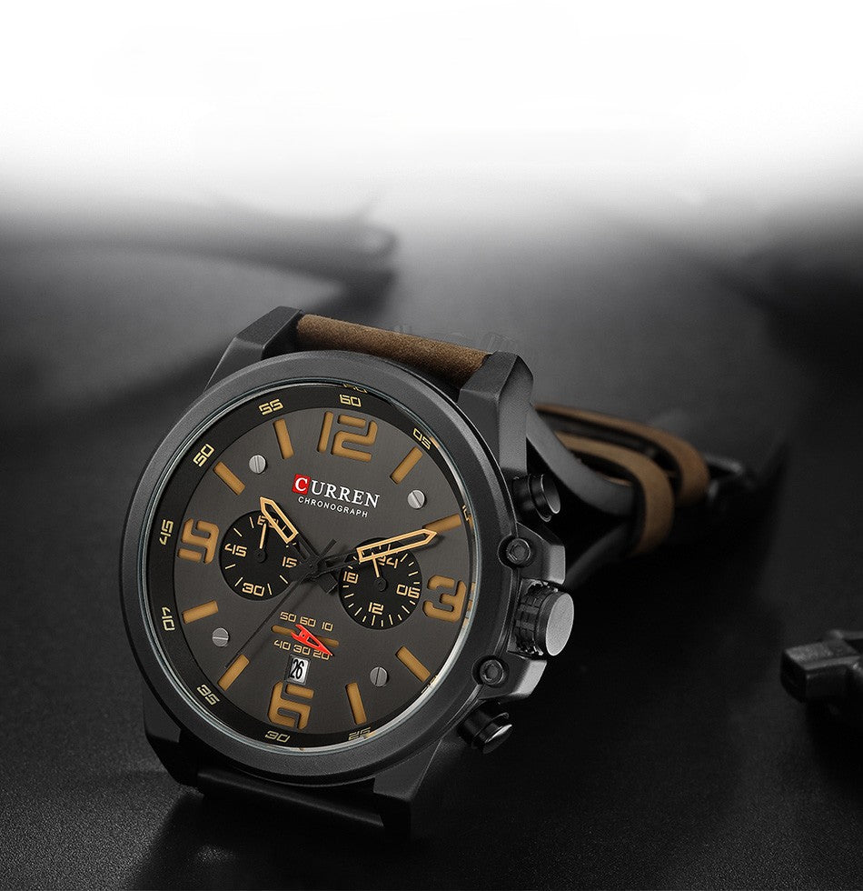 sMatte black finish paired with a genuine leather strap for rugged sophistication.