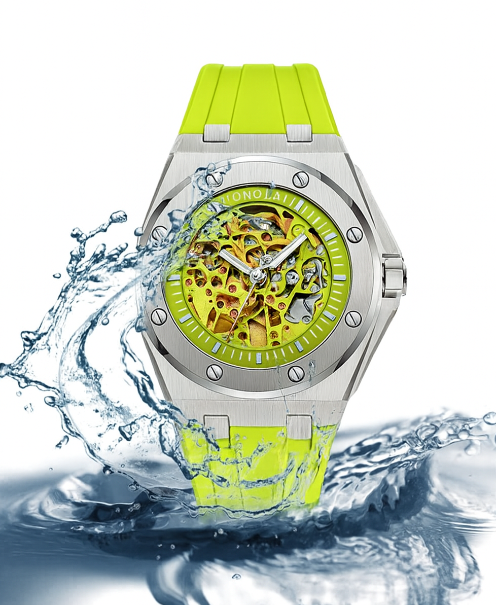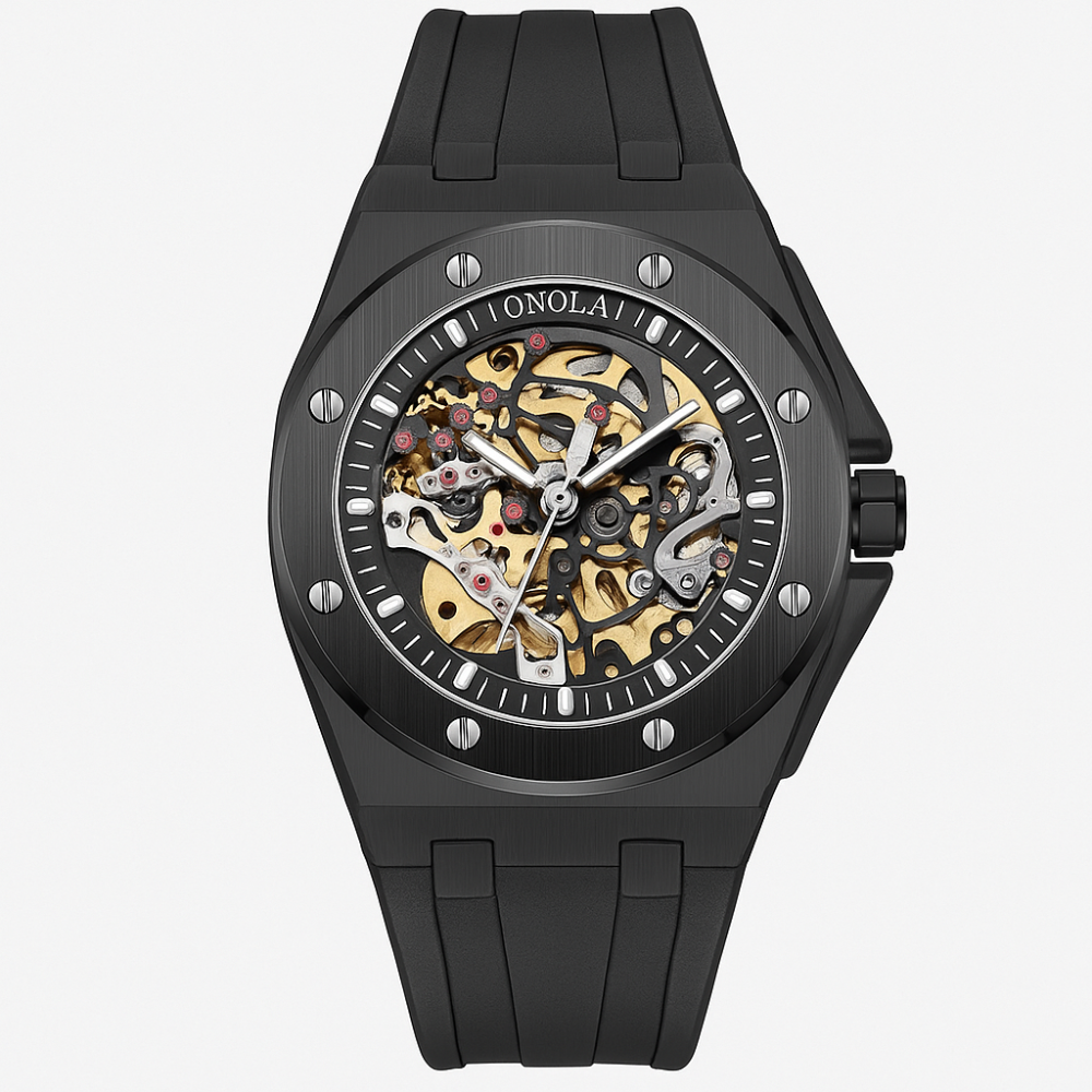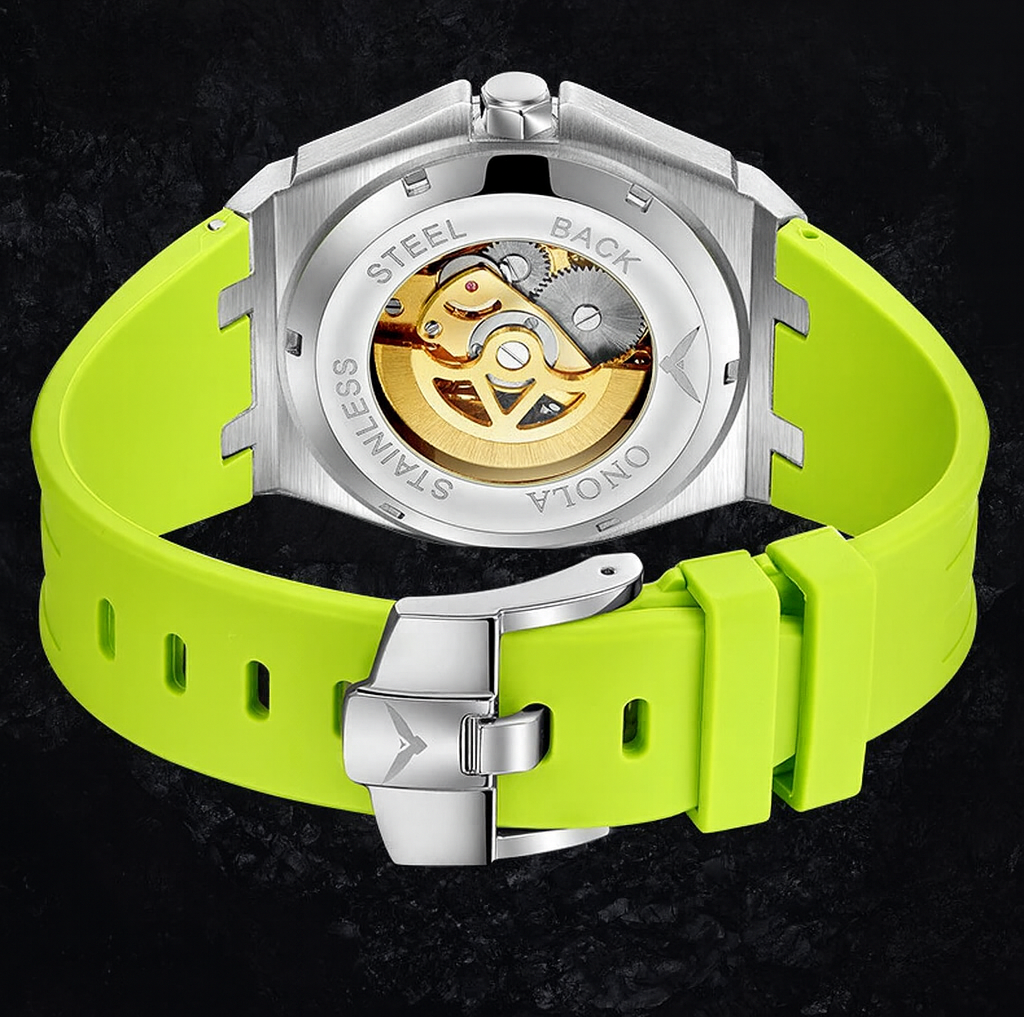 Transparent dial reveals the self-winding mechanism, showcasing the beauty of automatic precision.